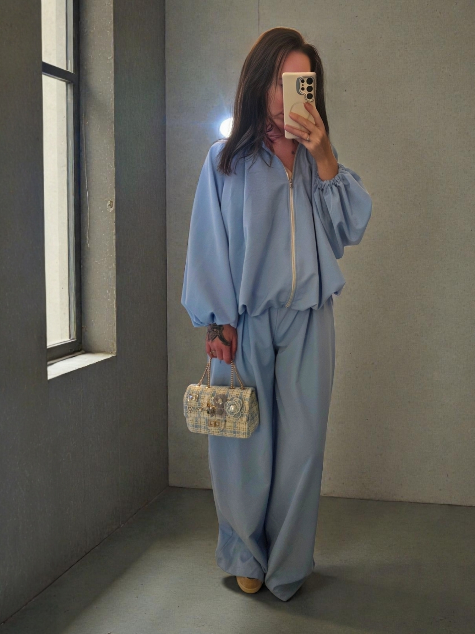 This powder-blue co-ord is designed for effortless sophistication, featuring a relaxed zip-front top with subtle volume sleeves paired with fluid wide-leg trousers. Lightweight, draping beautifully, and endlessly wearable — dress it up with heels or keep it relaxed with trainers.
